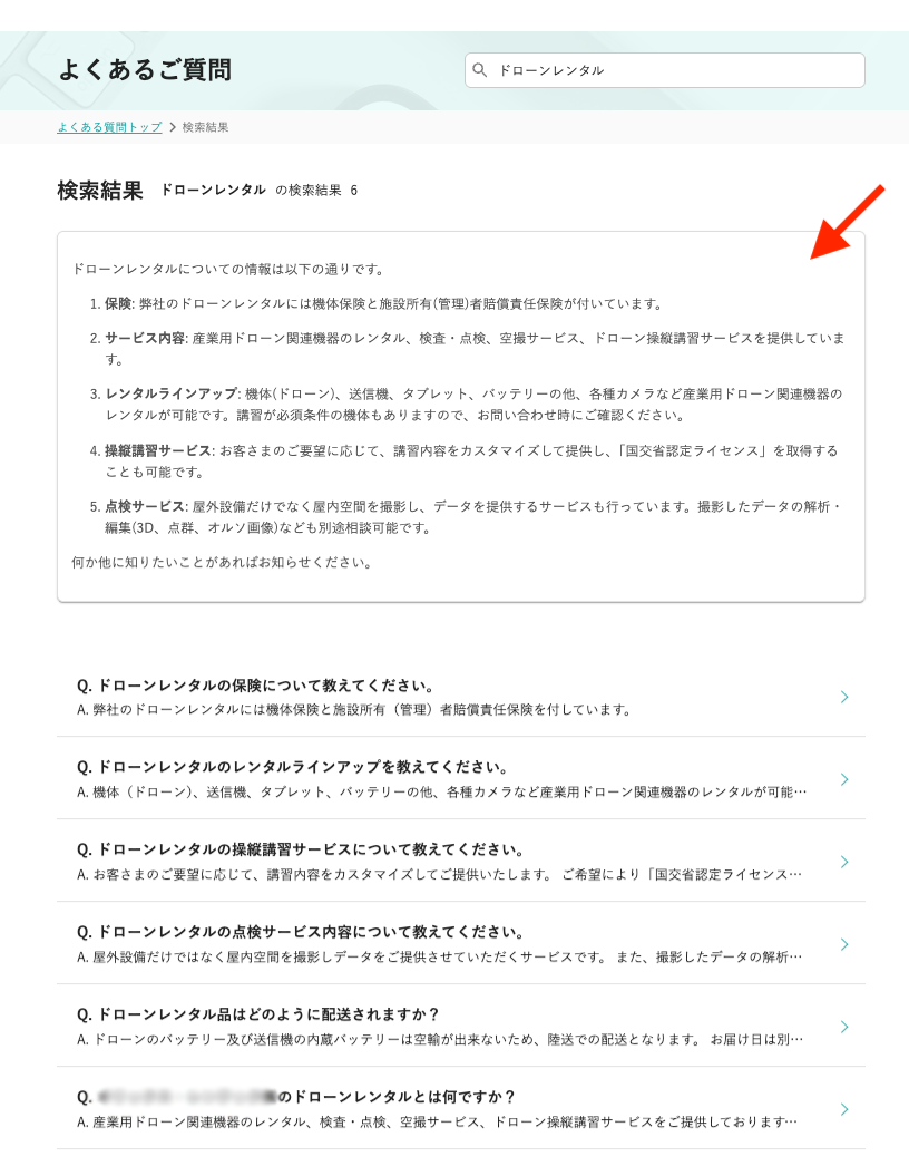 FAQ検索ページでキーワードを入力すると、検索結果の上部にAI生成の回答が自動的に表示されます。