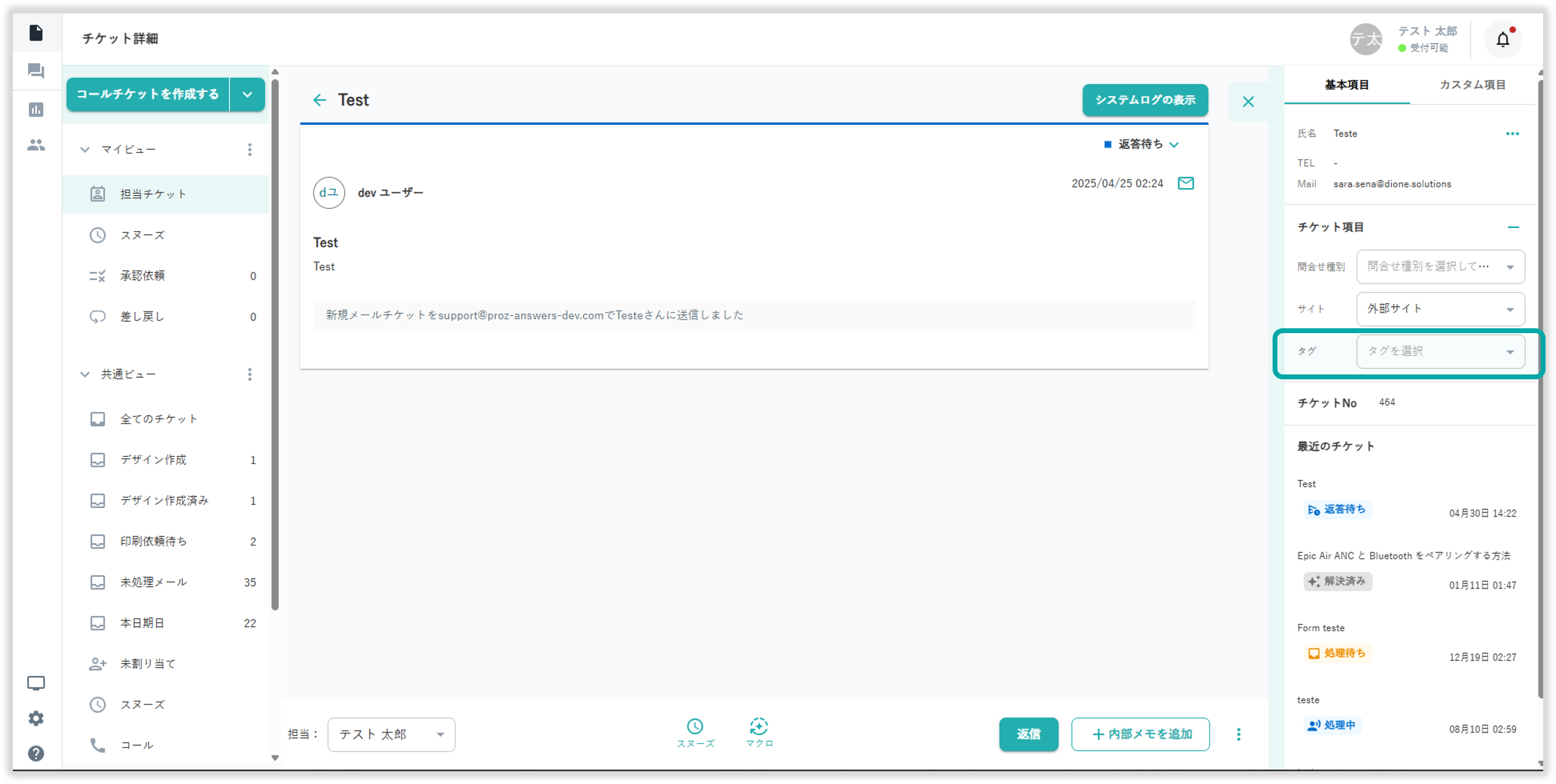 チケットタグを利用することで、チケットビューによる絞り込みや特定のタグを条件にした自動アクションの作成が可能です。チケットタグを新規作成する方法こちら