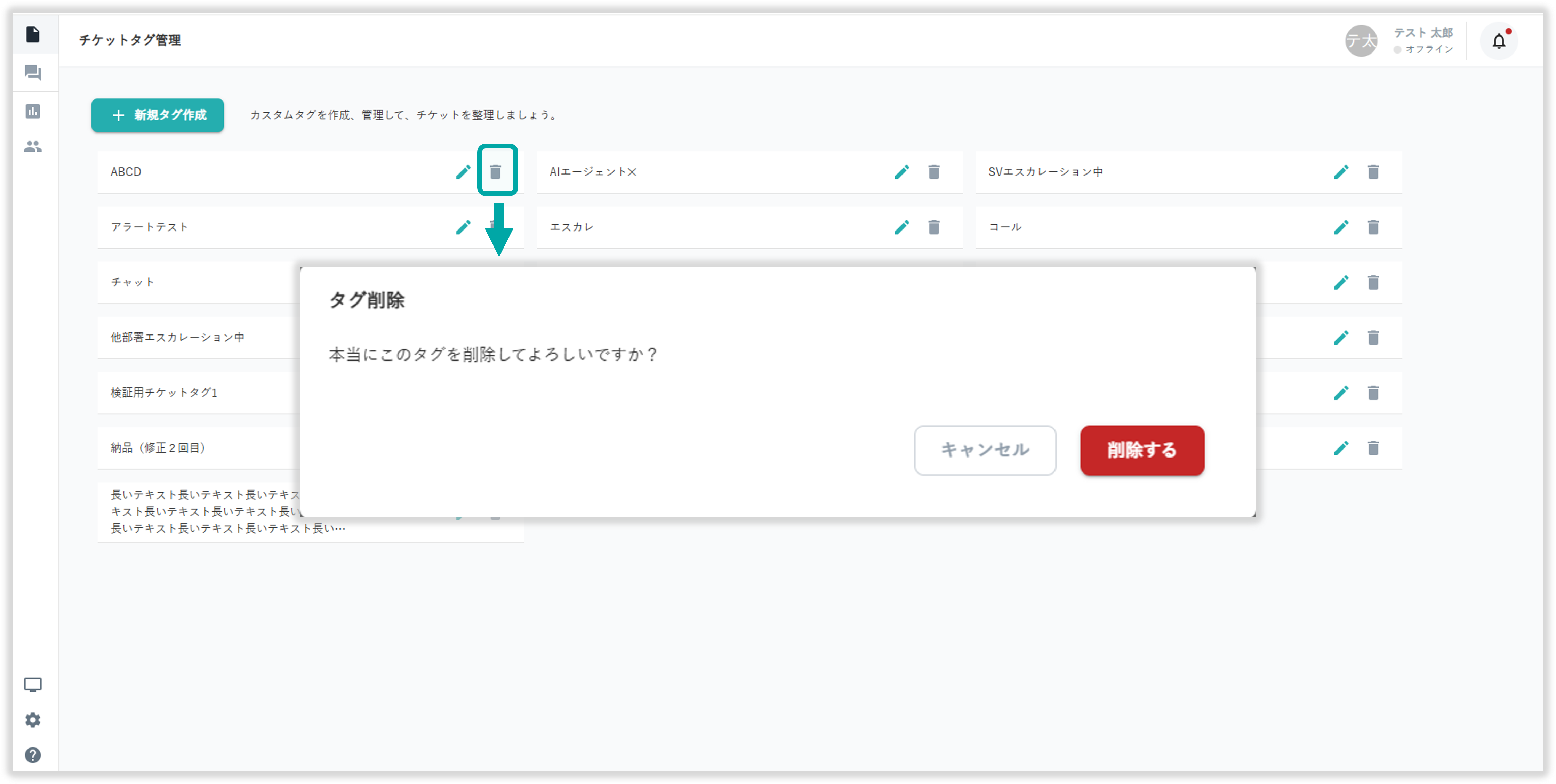チケットタグ管理画面の アイコンを選択してチケットタグの削除が行えます。
