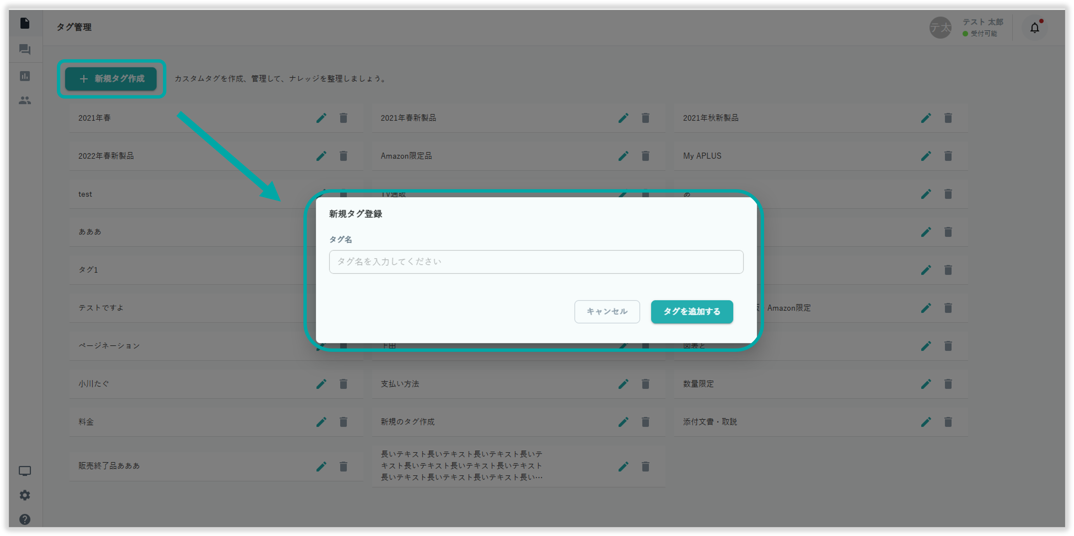 ナレッジタグ管理画面左上の「新規タグ作成」を選択してナレッジタグの新規作成が行えます。