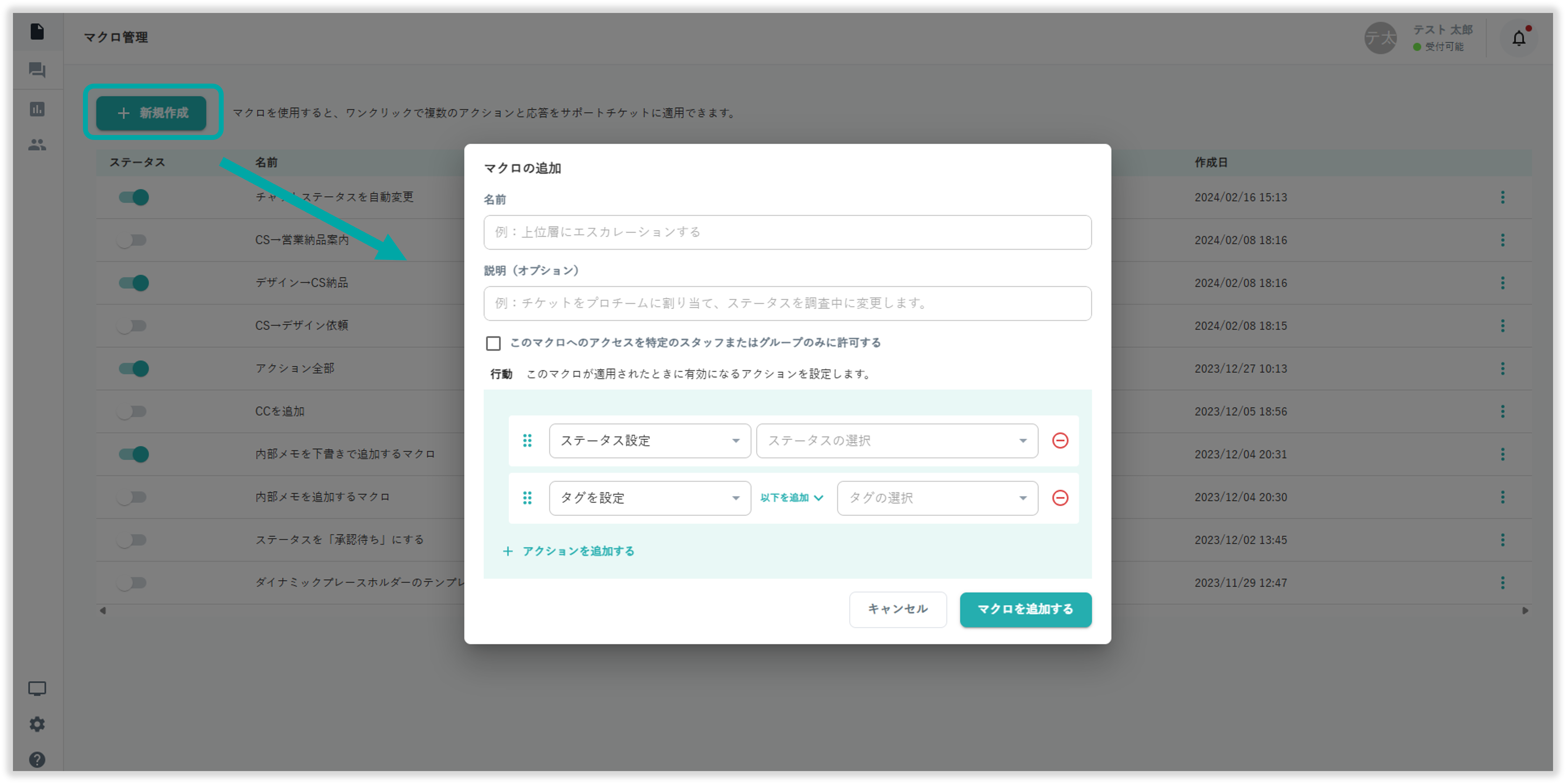 「このマクロへのアクセスを特定のスタッフまたはグループにのみ許可する」にチェックを入れてスタッフまたはグループを選択することで、マクロを利用できるスタッフを制限できます。