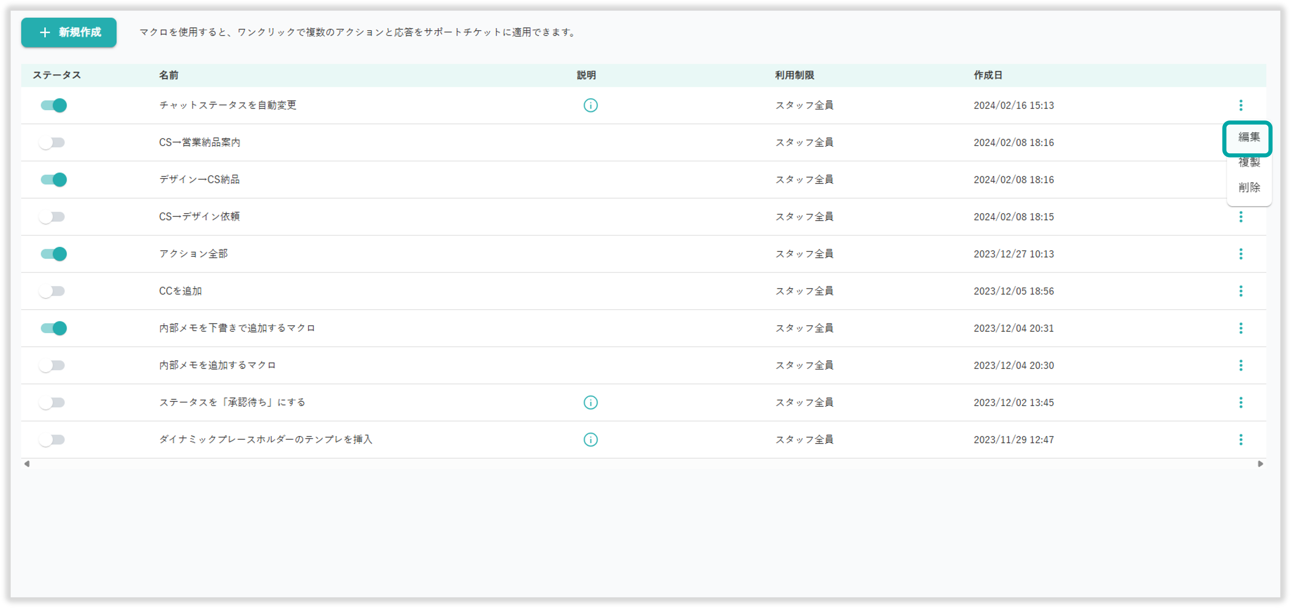 マクロ一覧右側の3点リーダーから「編集」を選択することでマクロ編集画面へ遷移できます。