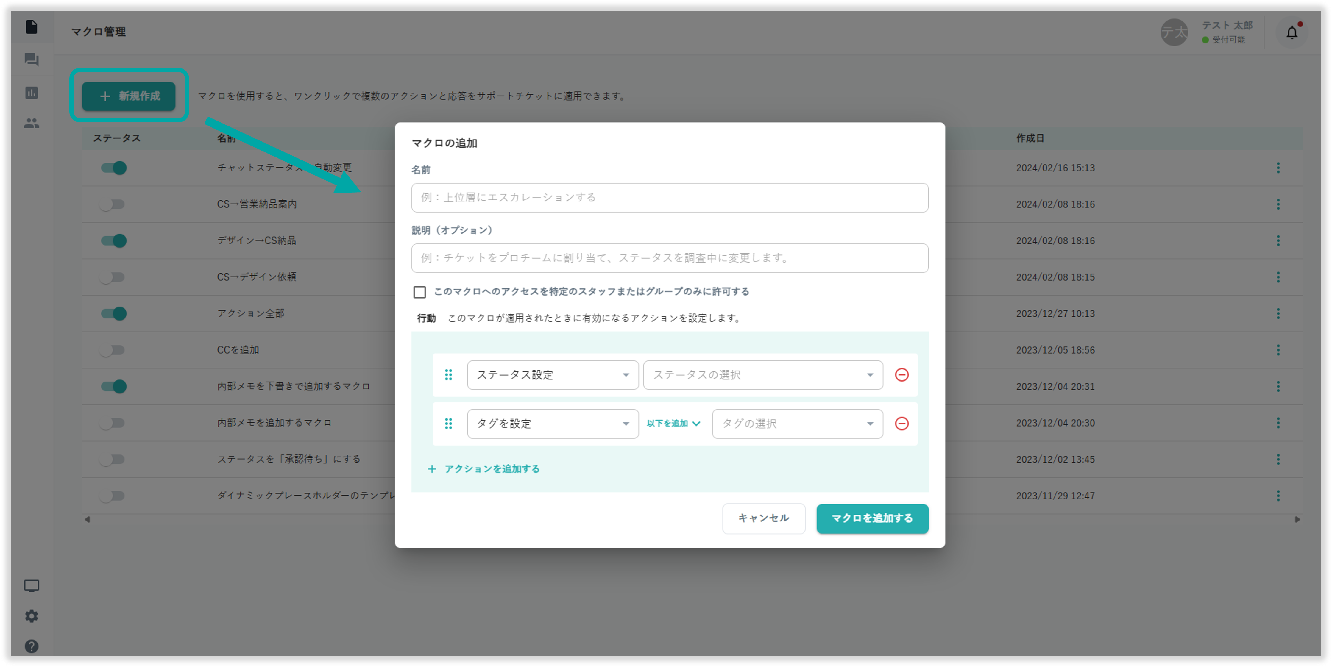 チケットの返信、内部メモを追加、タグの設定を1ボタンで適用できるマクロを作成できます。