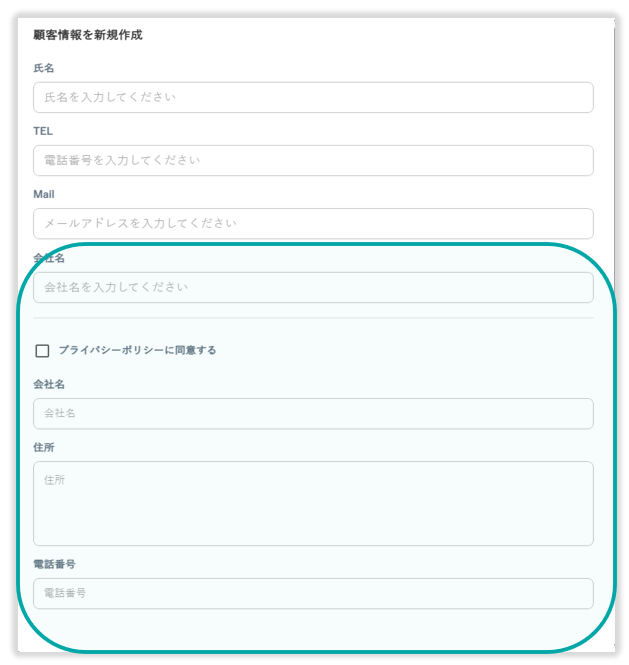 既存項目以外の項目を任意に追加することで、顧客情報として登録可能です。