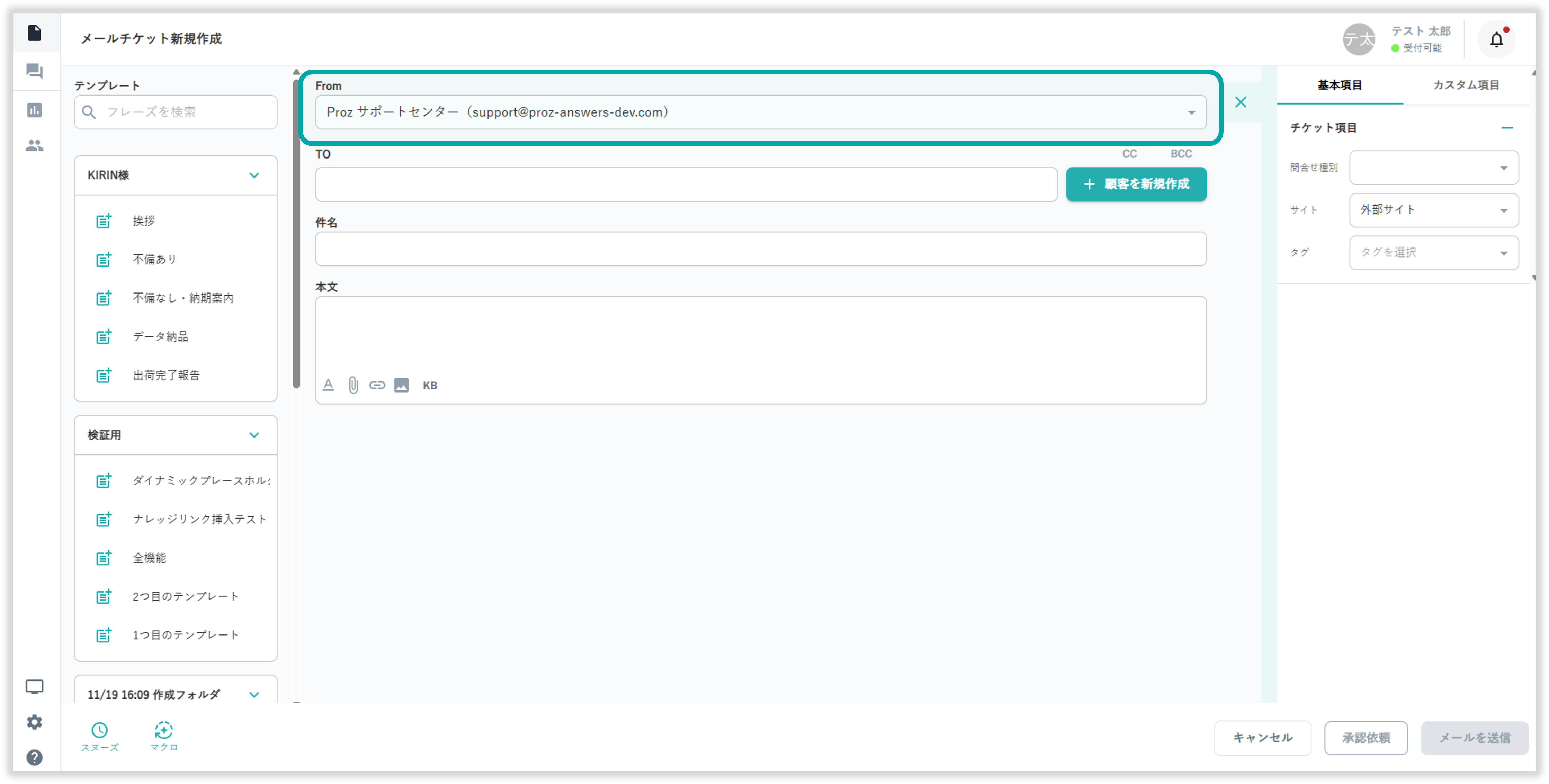 メールチケット新規作成画面上部からFromアドレスを選択可能です。