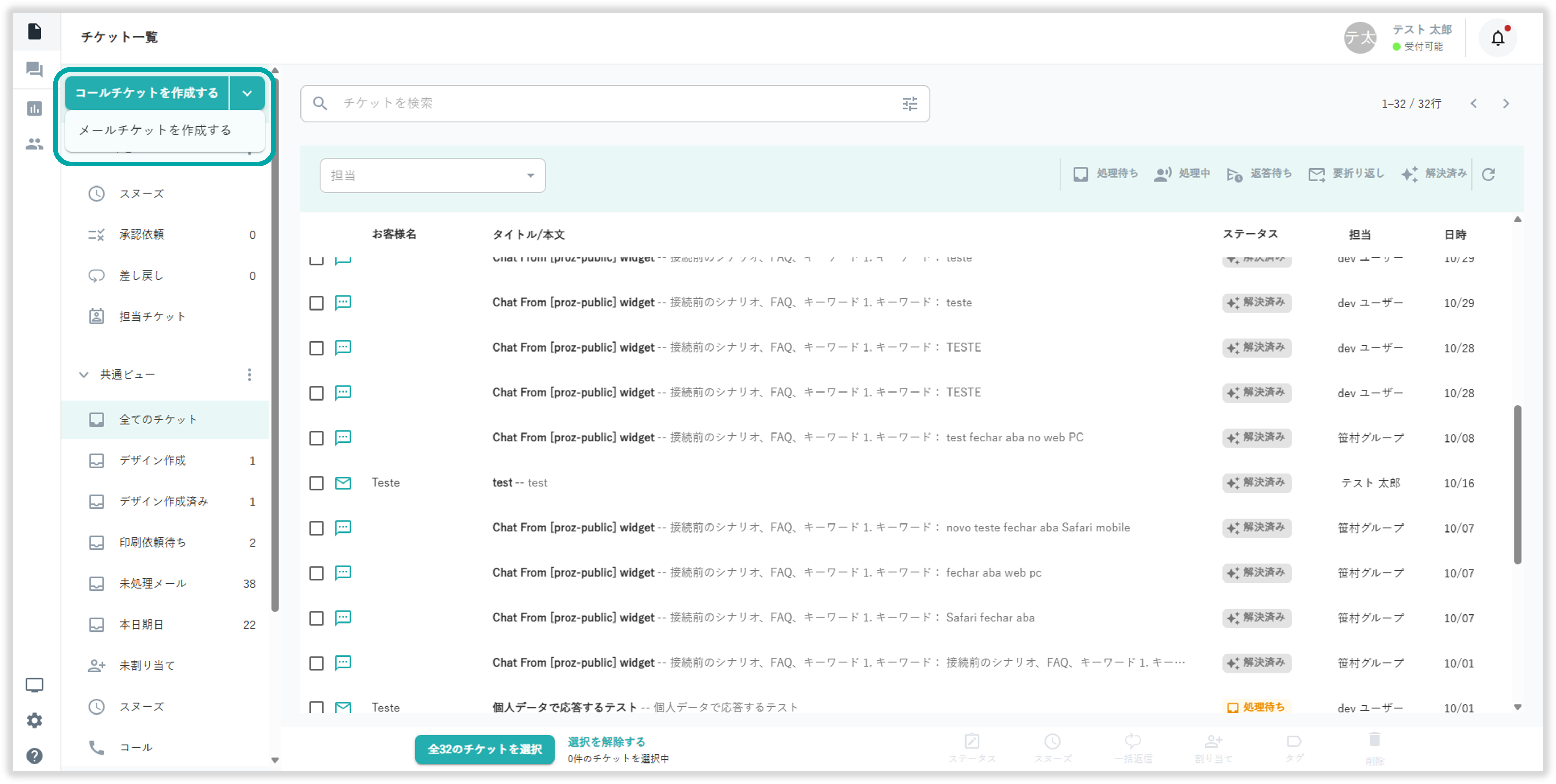 左メニューの 「チケット」 を選択することでチケット一覧画面を閲覧できます。