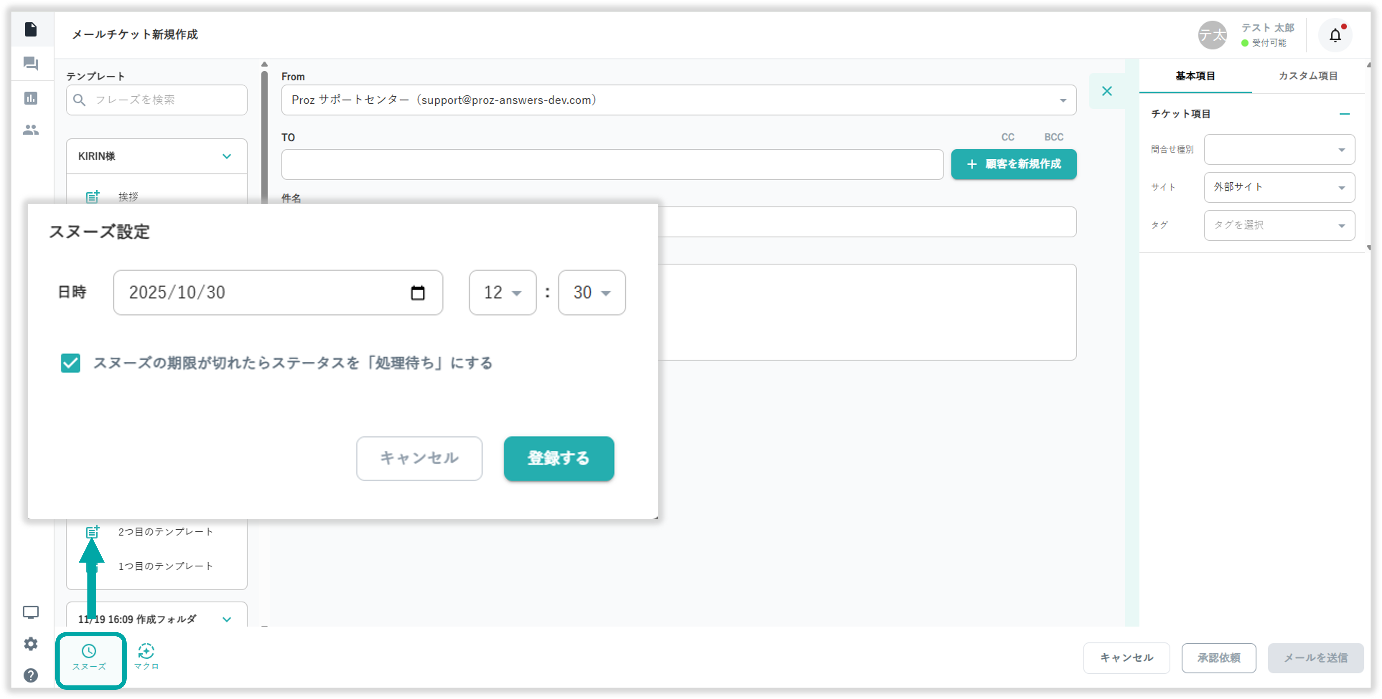 メールチケット作成画面の画面左下から登録チケットにスヌーズを設定可能です。
