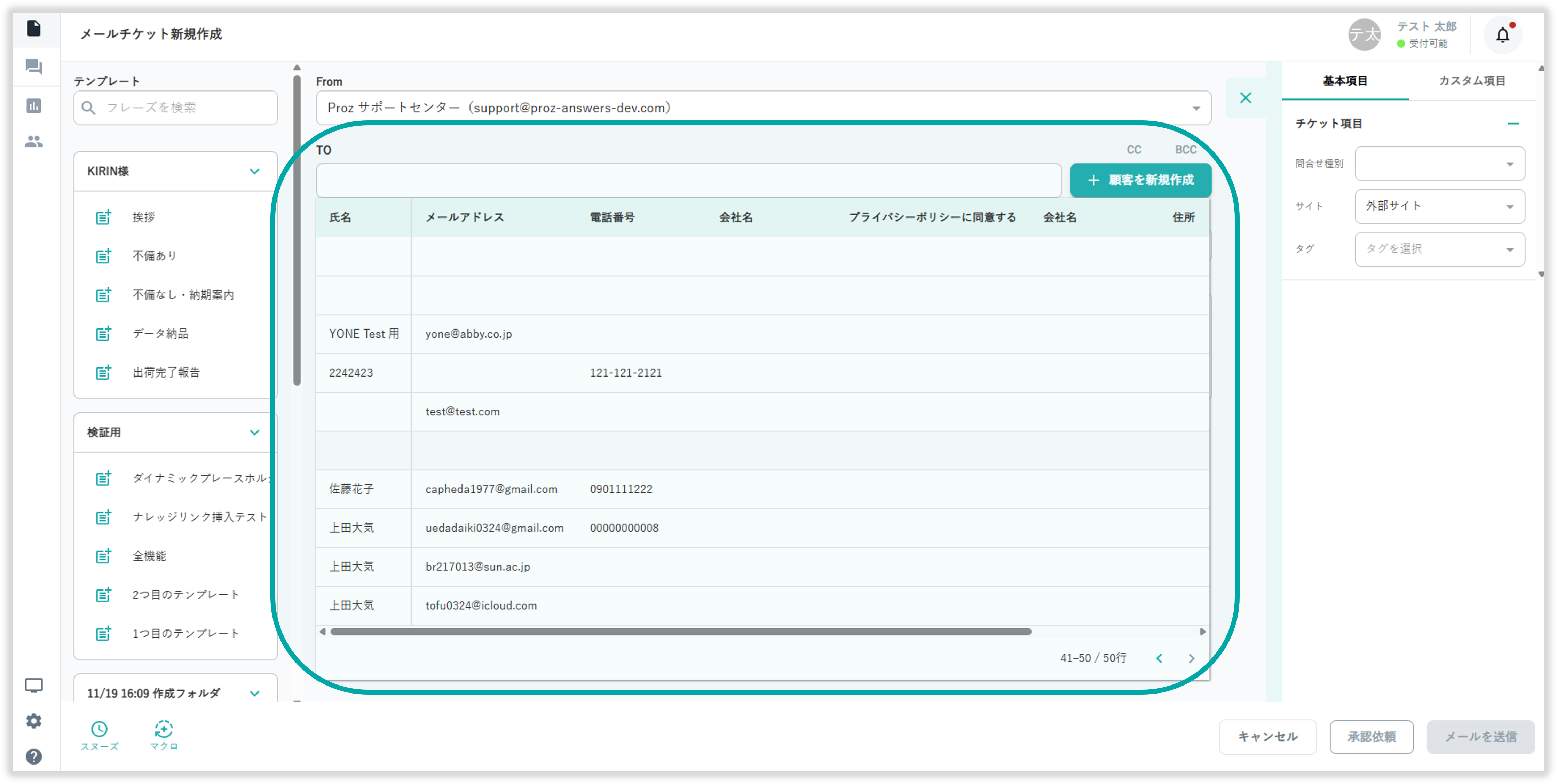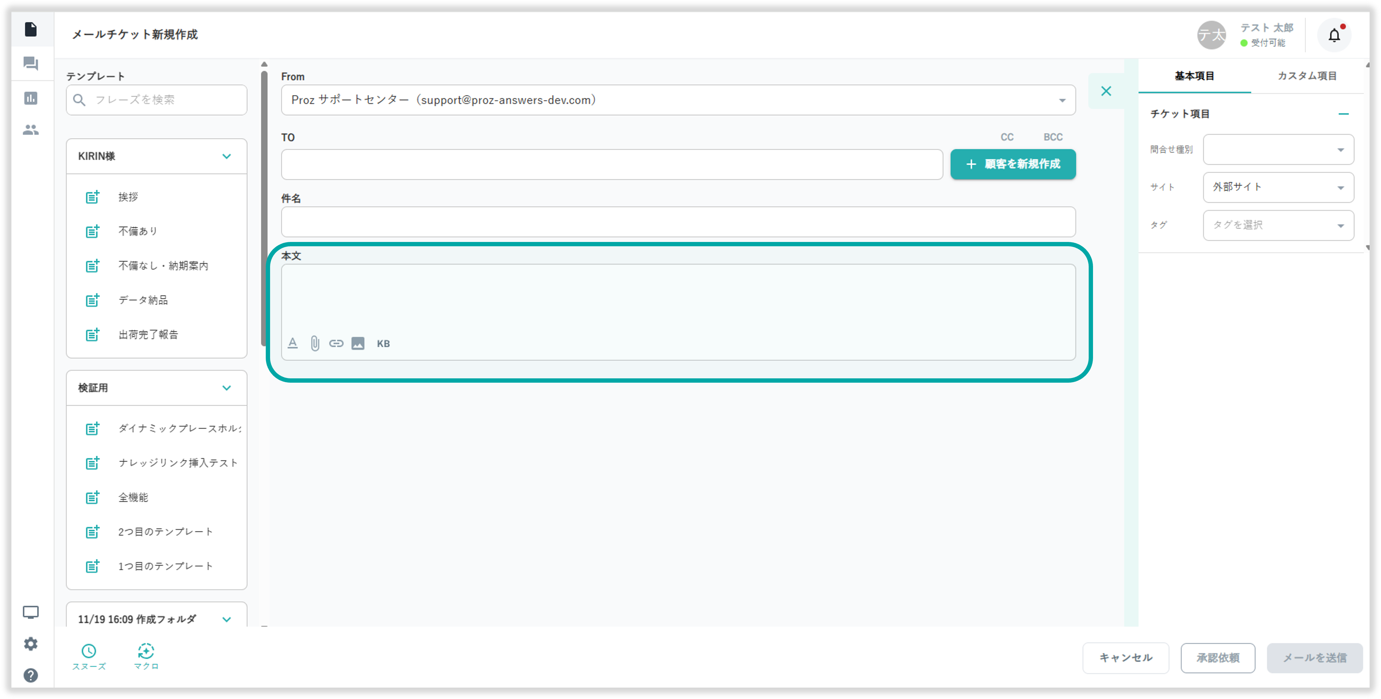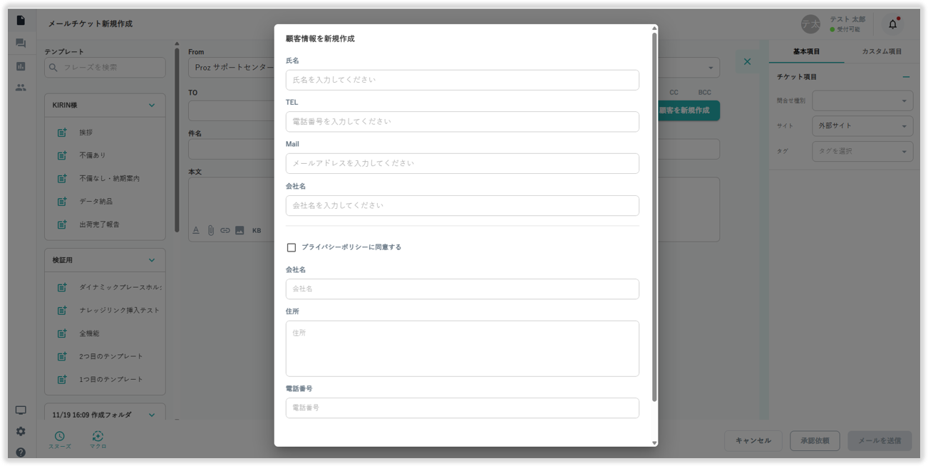 メールチケット作成画面の画面左からあらかじめ登録したテンプレートの挿入が可能です。