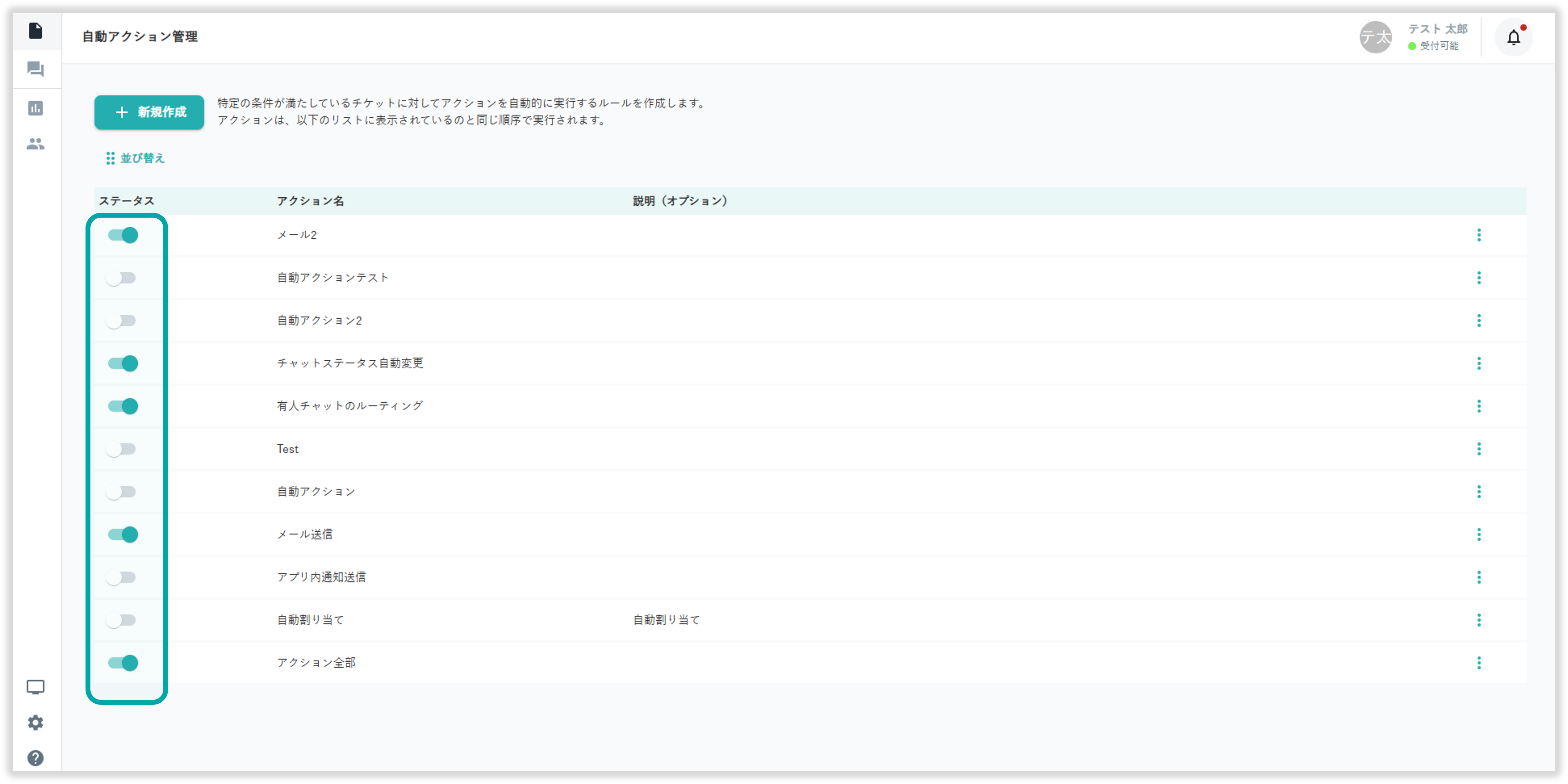 自動アクション管理画面の「ステータス」下のトグルから自動アクションの 有効/無効 を変更できます。