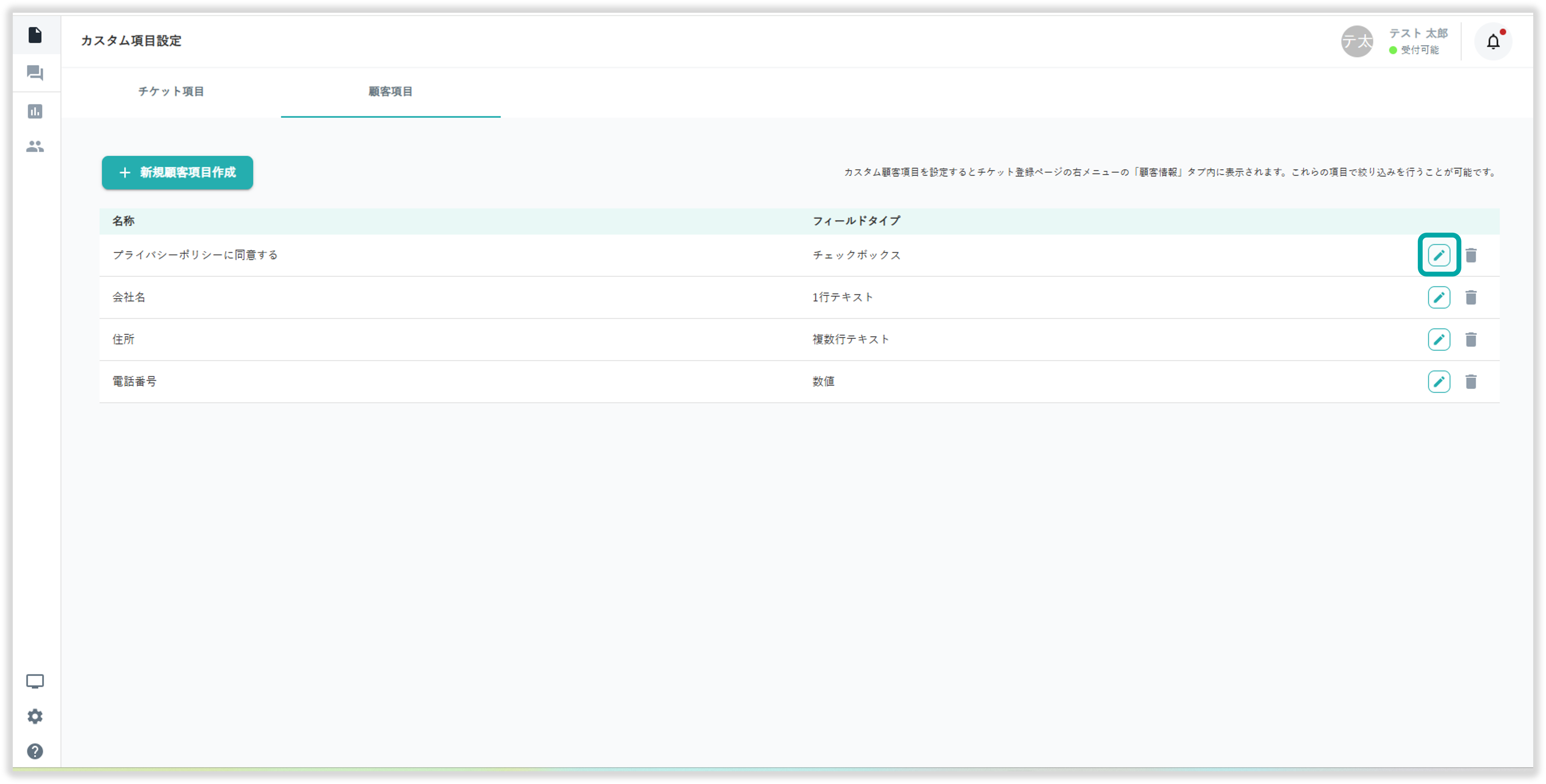 顧客カスタム項目右側のアイコンを選択することで顧客カスタム項目の編集を行えます。