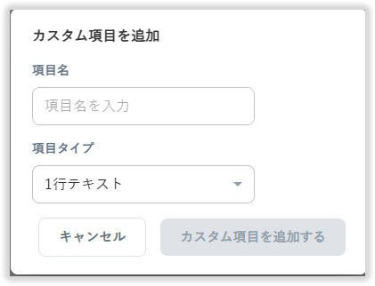 1行テキスト短いテキストの入力を想定したカスタム項目です。例:性別、会社名など複数行テキスト改行のできる長いテキストの入力を想定したカスタム項目です。例:住所、備考など数値数時の入力を想定したカスタム項目です。数字の入力のみ行えます。例:郵便番号、西暦などドロップダウンリストあらかじめ定義した項目を選択させることができるカスタム項目です。例:商品名、都道府県など「オプションを追加する」から選択肢の追加が行えます。リストの左側にあるアイコンをドラック&ドロップすることで並び替えが可能です。「複数選択可能にする」にチェックを入れることでリストの項目を複数選択できるようになります。※選択肢の名称を変更すると、変更前の選択肢のデータは削除されますのでご注意ください。チェックボックスチェックボックスを作成できます。例:利用規約に同意する などマルチレベル複数の階層を持ったリストを作成することができます。例:第一種別に商品名、第二種別に商品応じたカラー追加する。「第一種別項目を追加する」から第一種別の追加が行えます。リストの左側にあるアイコンをドラック&ドロップすることで並び替えが可能です。リストの右側にあるアイコンを選択することで、下階層にリストを追加できます。リストの右側にあるアイコンを選択することで、リストの削除が行えます。