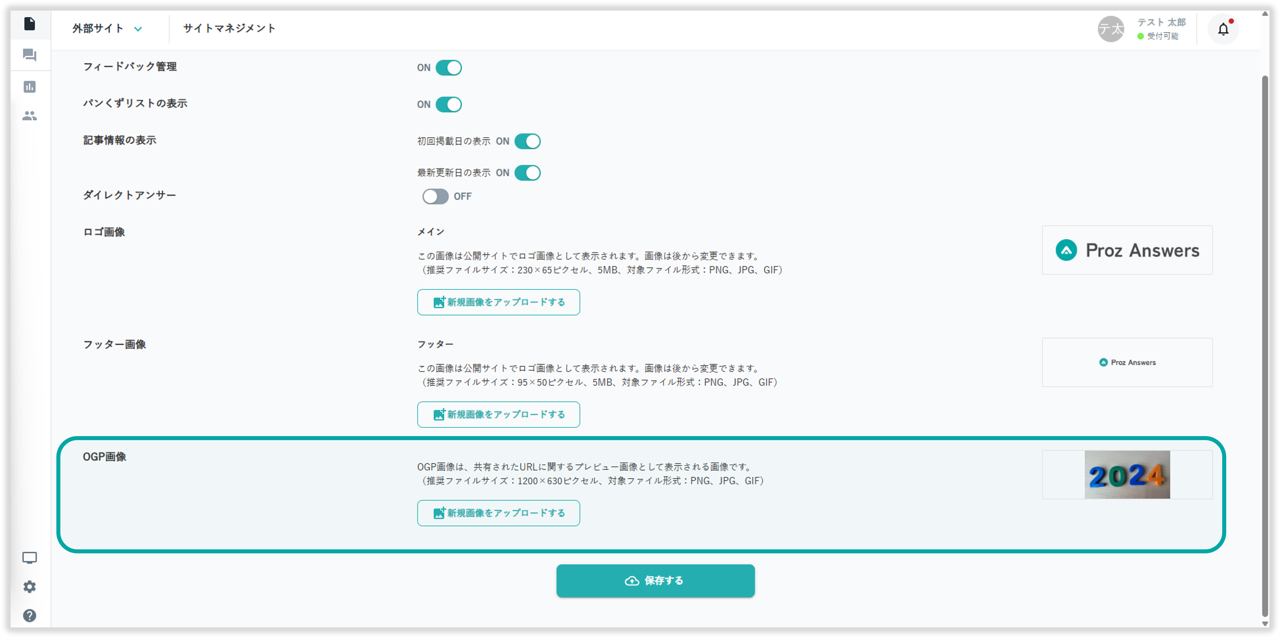 設定>ナレッジ設定>サイトマネジメント>その他設定 からOGP画像を設定できます。