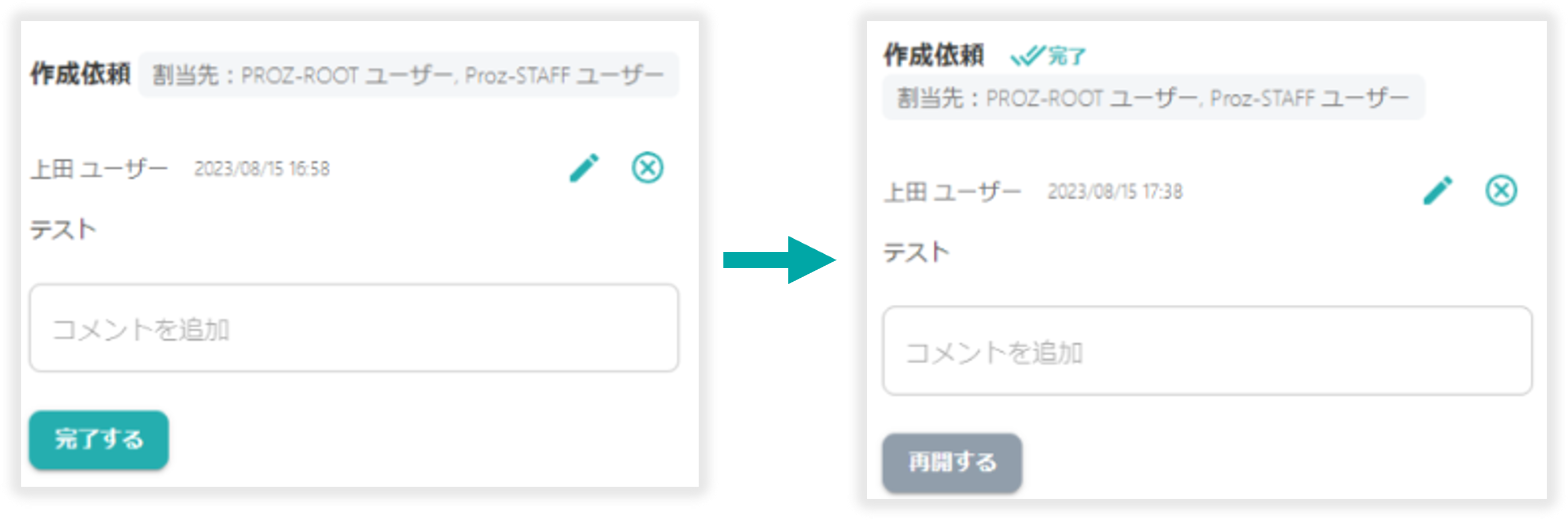 完了したタスクはタスク一覧の「完了する」を選択することで、タスク作成者とタスクを割り当てられたスタッフにタスク完了の通知が送信されます。
