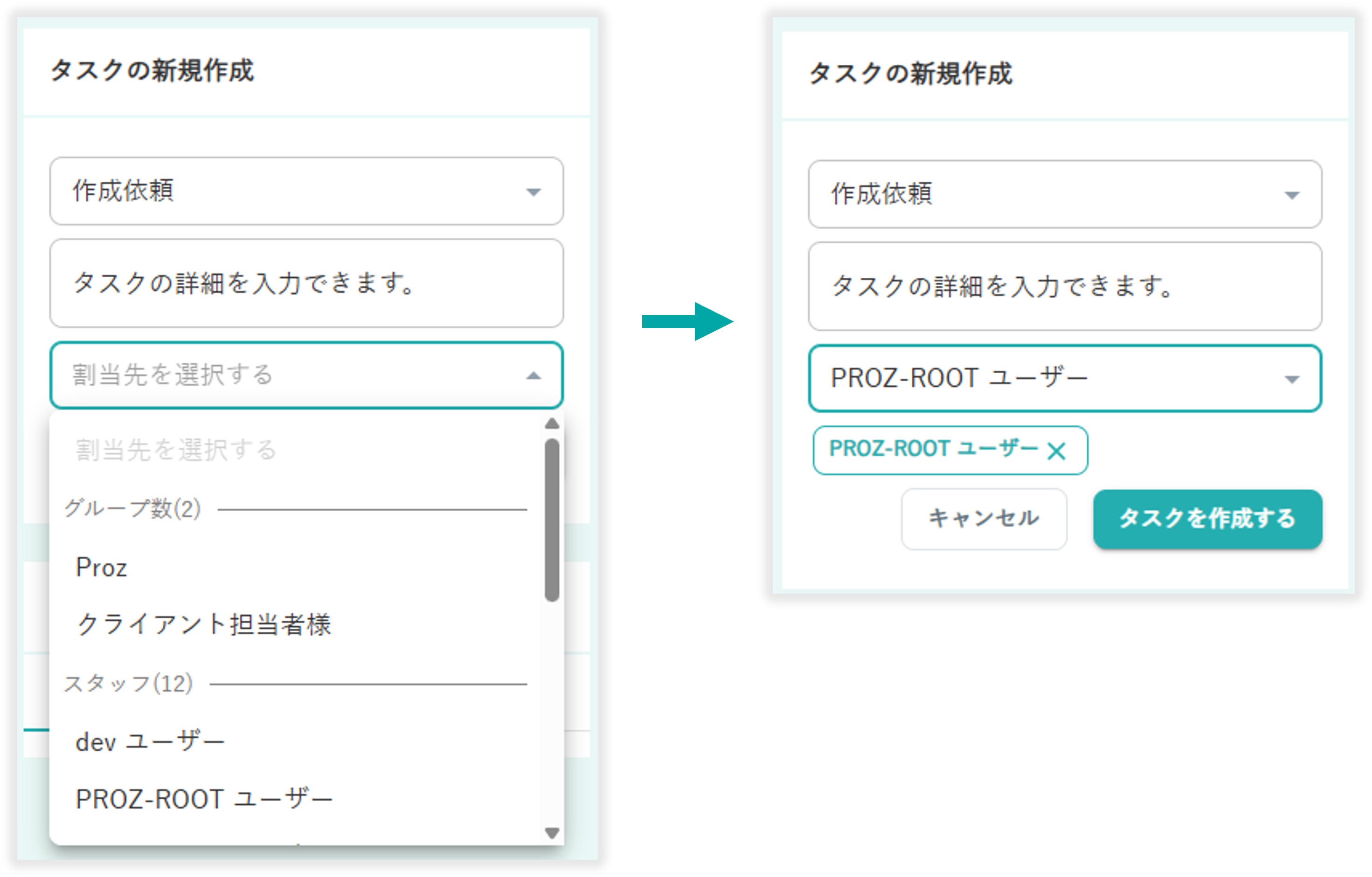 4. タスク作成の際は「作成依頼」「更新依頼」「レビュー依頼」からタスクの種類を選択してください。