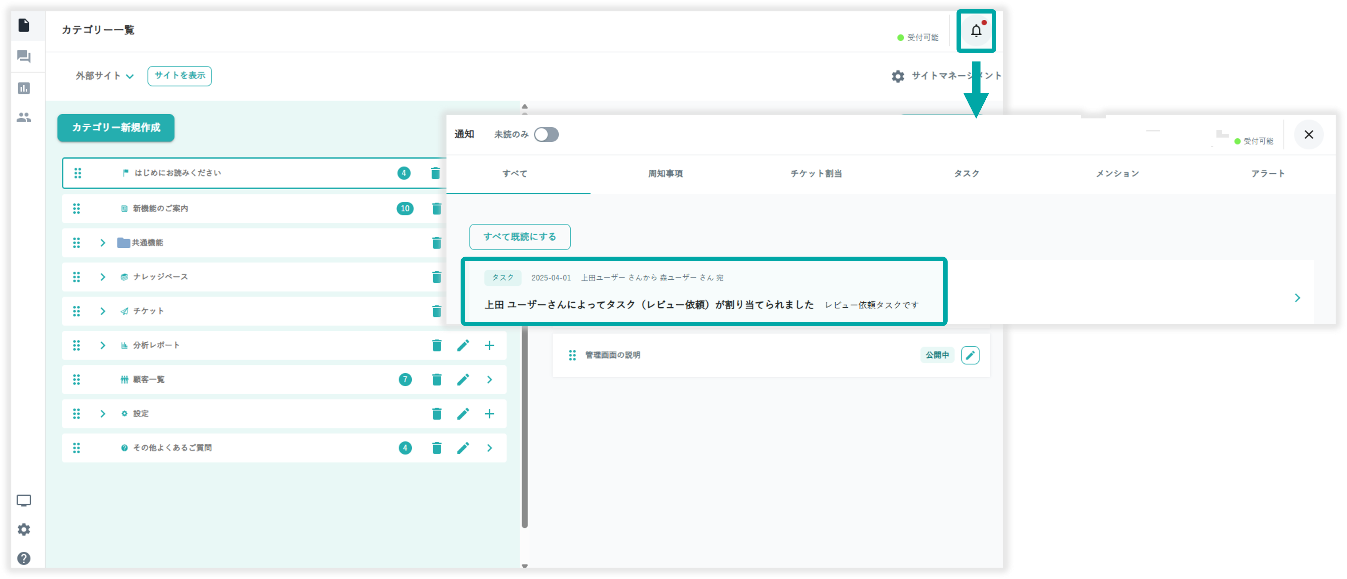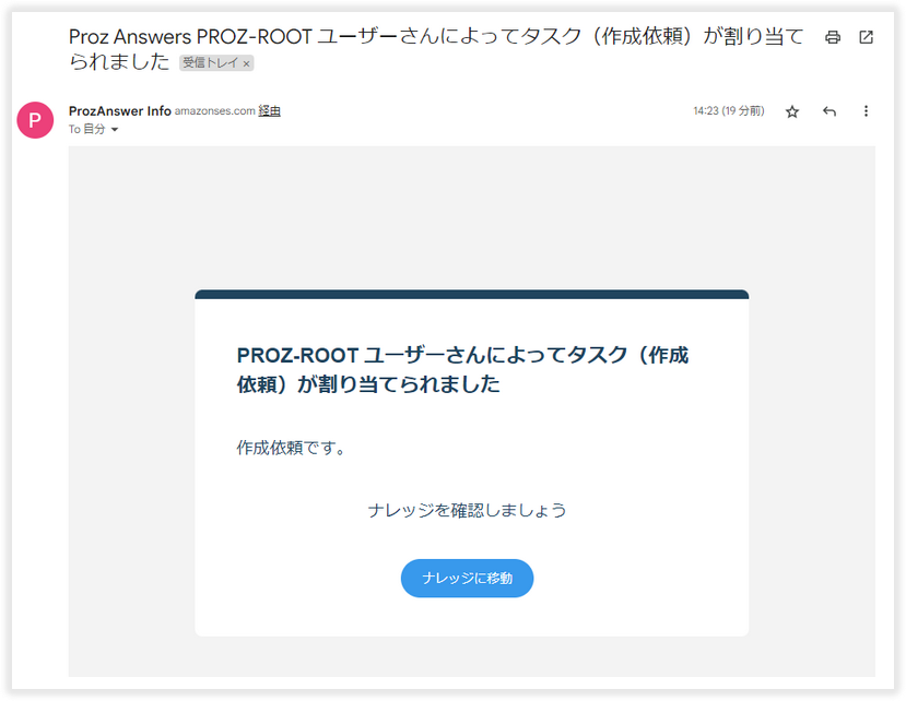 タスクが作成された際に割当先に設定されているユーザーにアプリ内通知およびメール通知が送信されます。