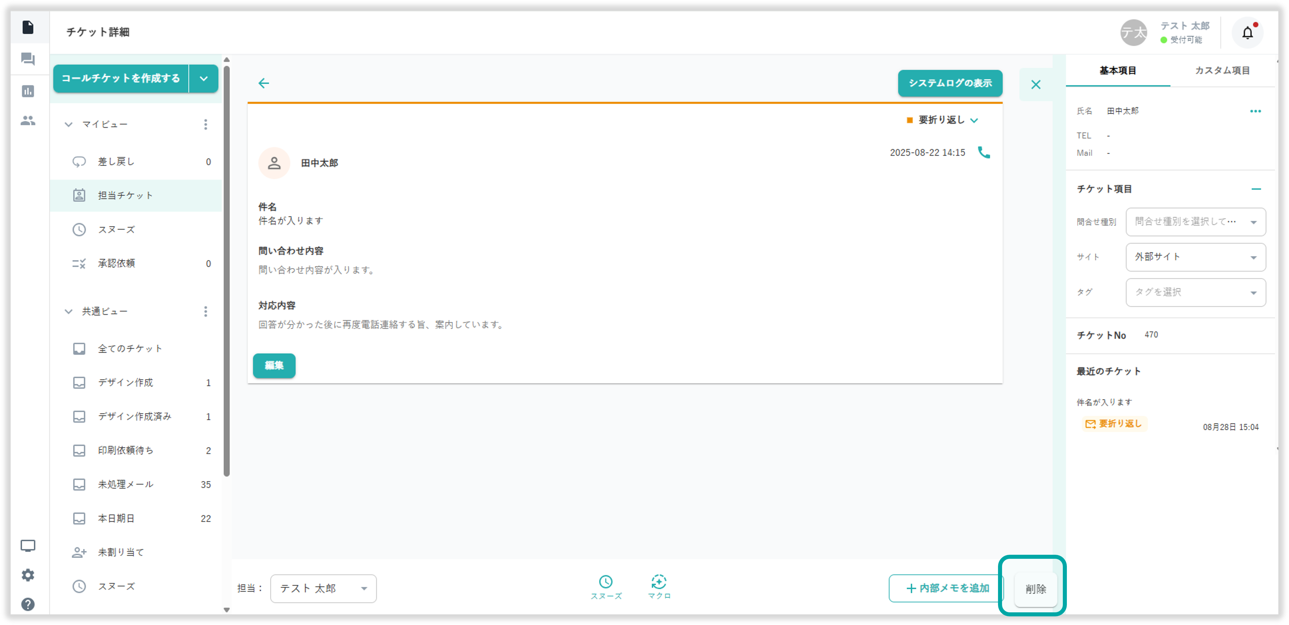 を選択してチケットの削除が行えます。