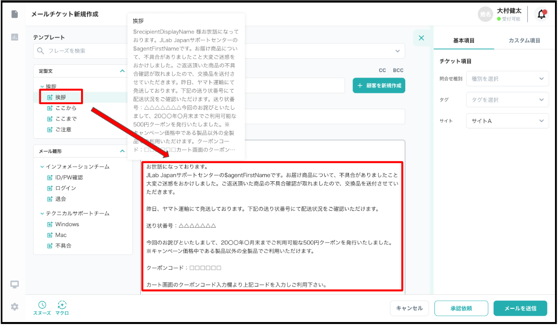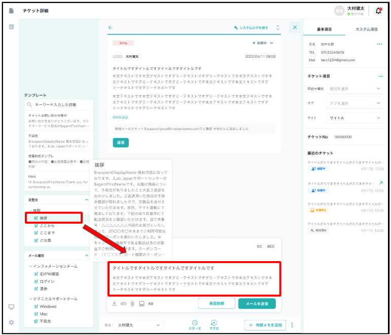 メール/コール チケット新規作成画面の左側からテンプレートの挿入が可能です。