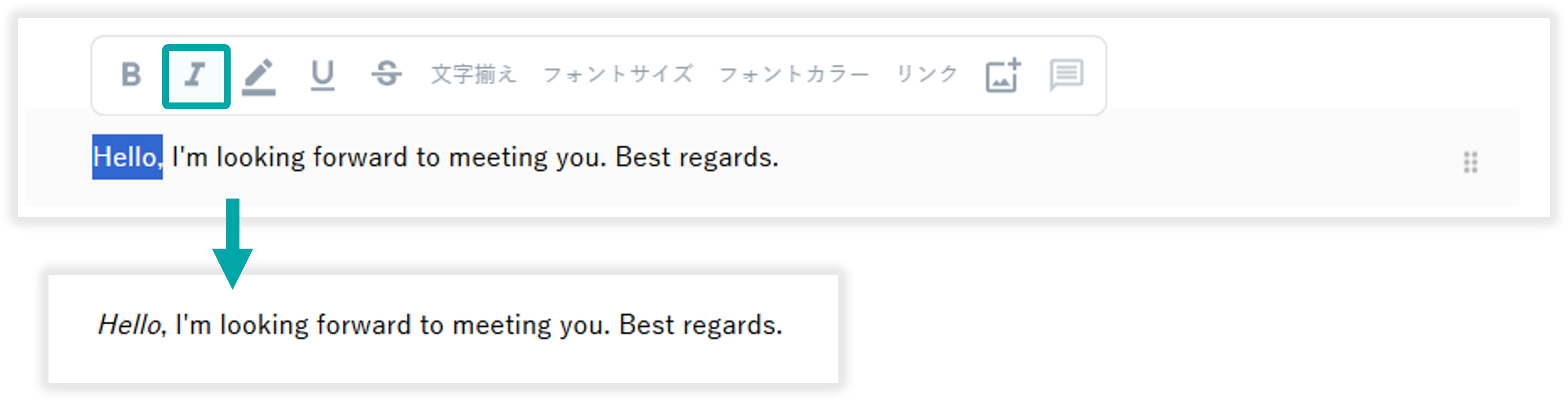 範囲選択したテキストを斜体文字に変更できます。斜体文字にできるのはアルファベットのみです。
