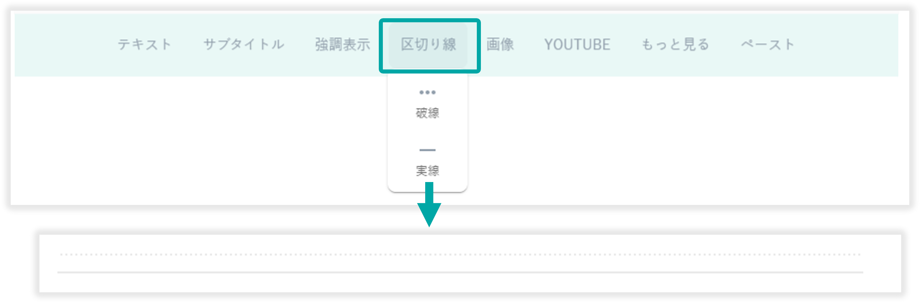 「区切り線」を選択することで、実践または破線を挿入可能です。