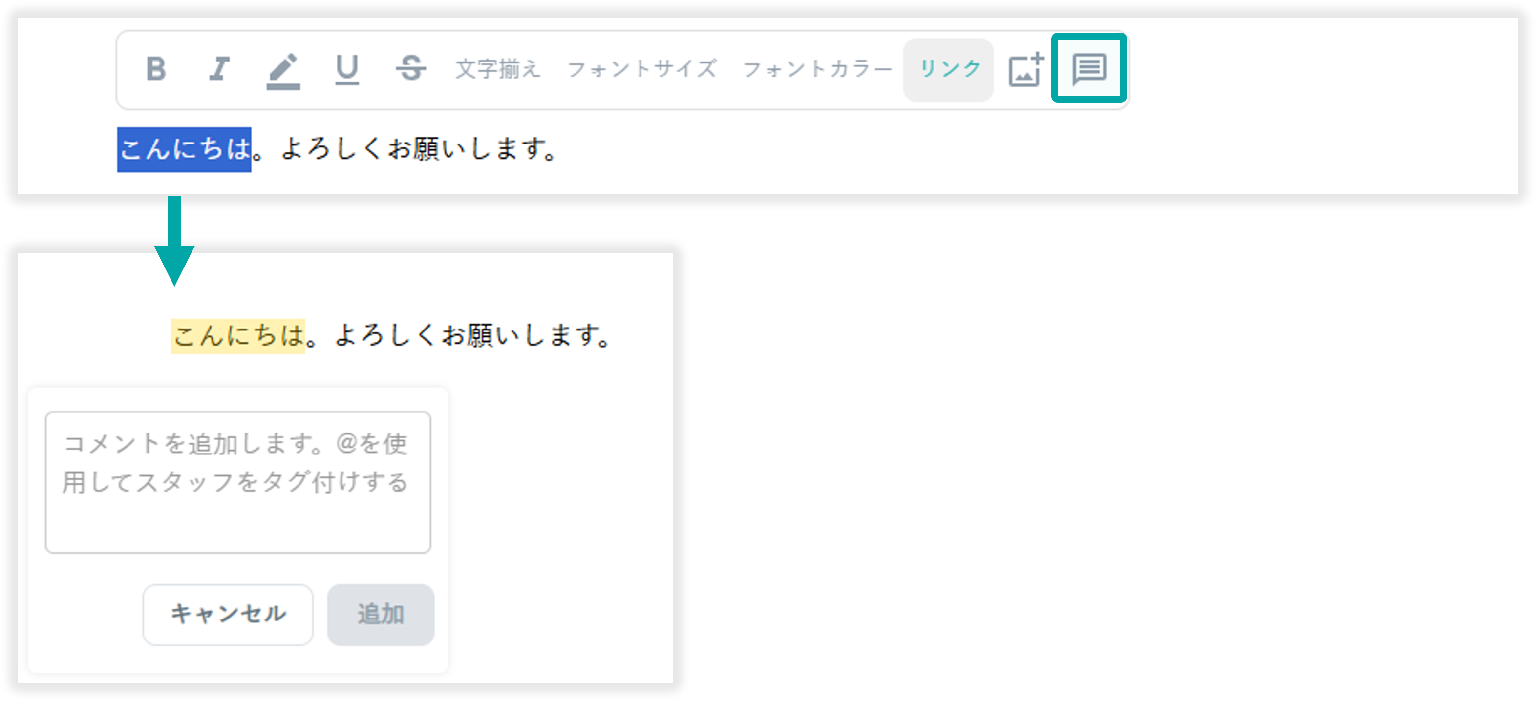 範囲選択したテキストにコメントを挿入できます。コメントは管理画面でのみ閲覧可能です。