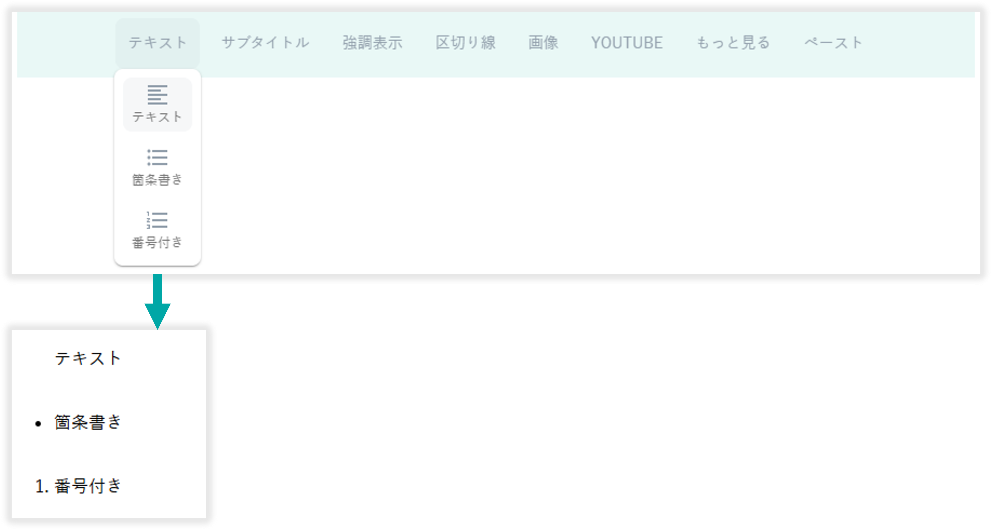 テキストには「テキスト」「箇条書き」「番号付き」の3種類があります。