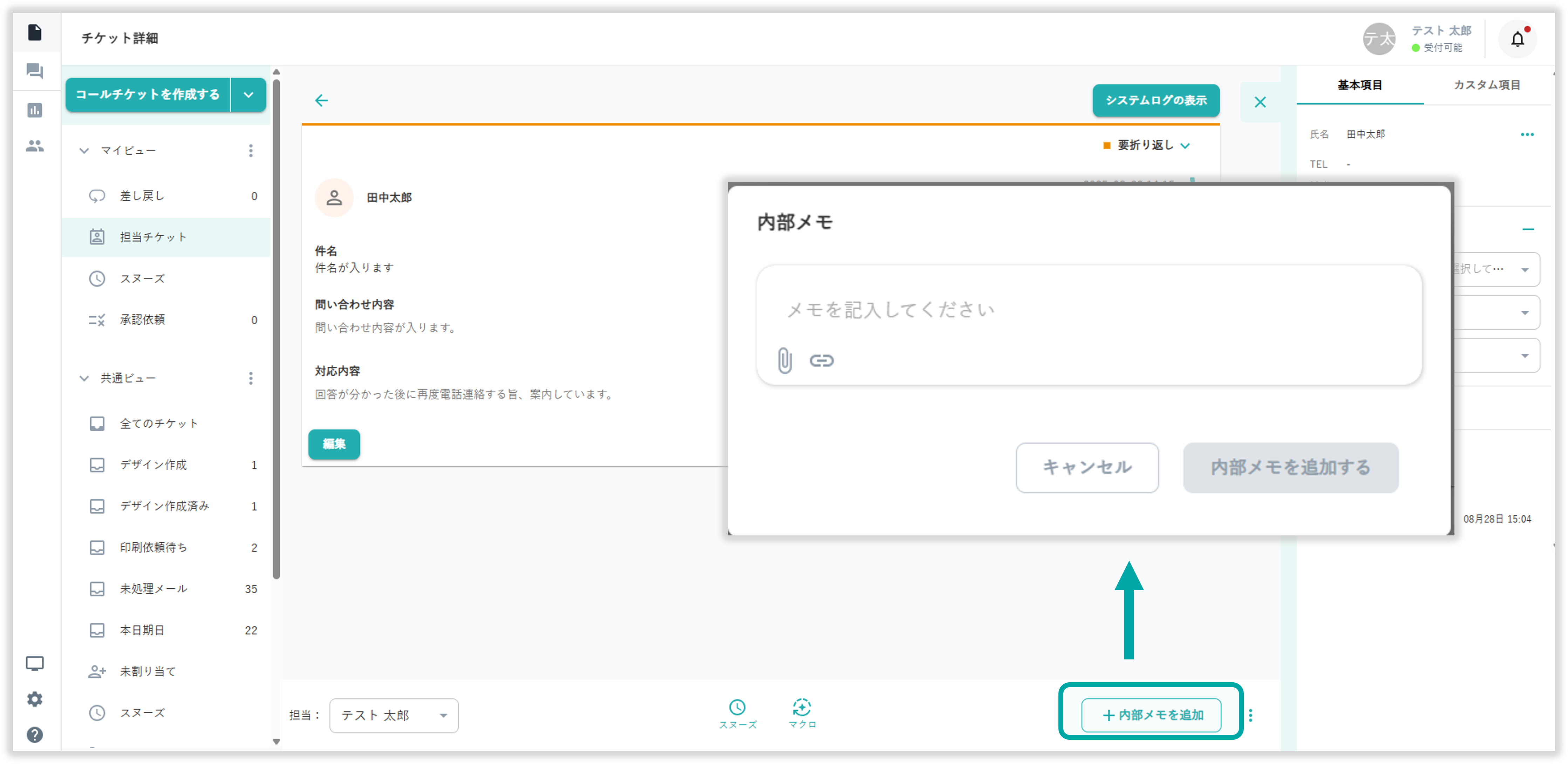 チケット詳細画面右下の「内部メモを追加」を選択して管理画面のみで表示されるメモを追加できます。