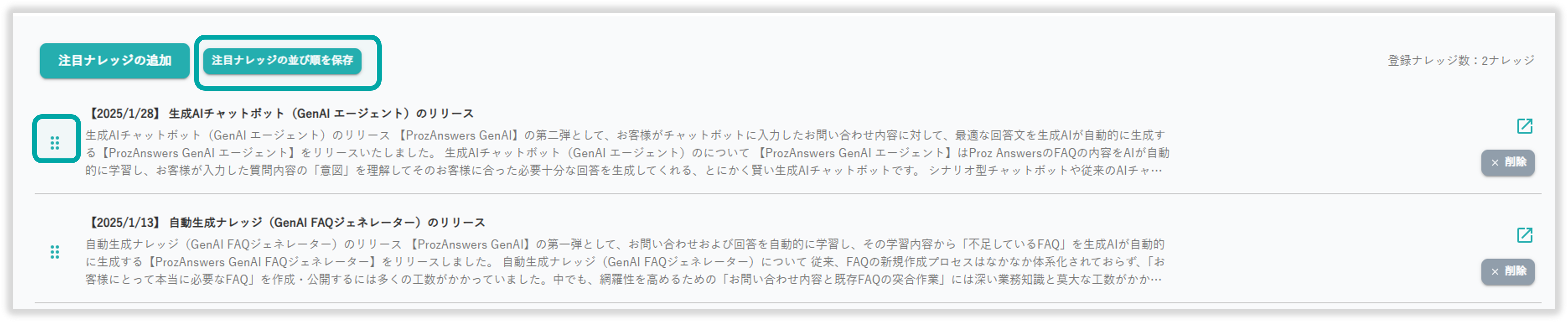 並び替え後に「注目ナレッジの並び順を保存」を選択することで、並び順を保存できます。