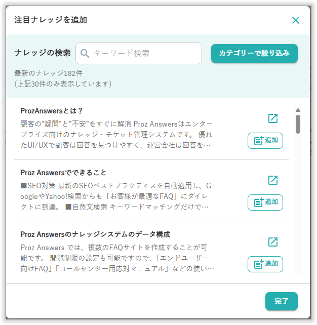 表示されたポップアップの画面右側の「追加」を選択し「完了」を押下することで、注目ナレッジを追加できます。
